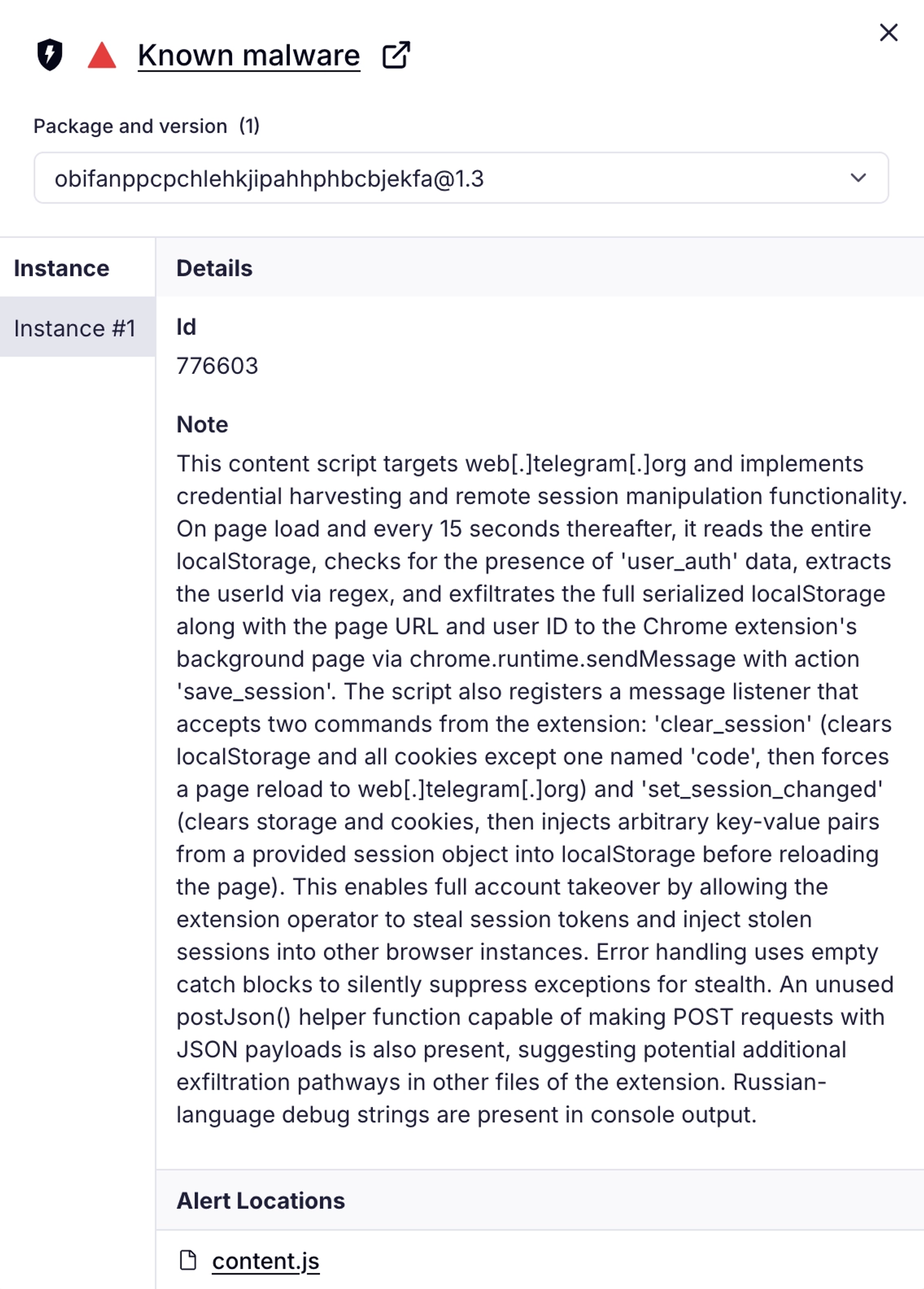 - [T1185 ] Browser Session Hijacking – The extension supports remote replacement of a victim’s Telegram session by clearing localStorage and writing attacker-supplied session data ( ‘it clears the victim’s localStorage, overwrites it with threat actor-supplied session data, and force-reloads Telegram.’ )