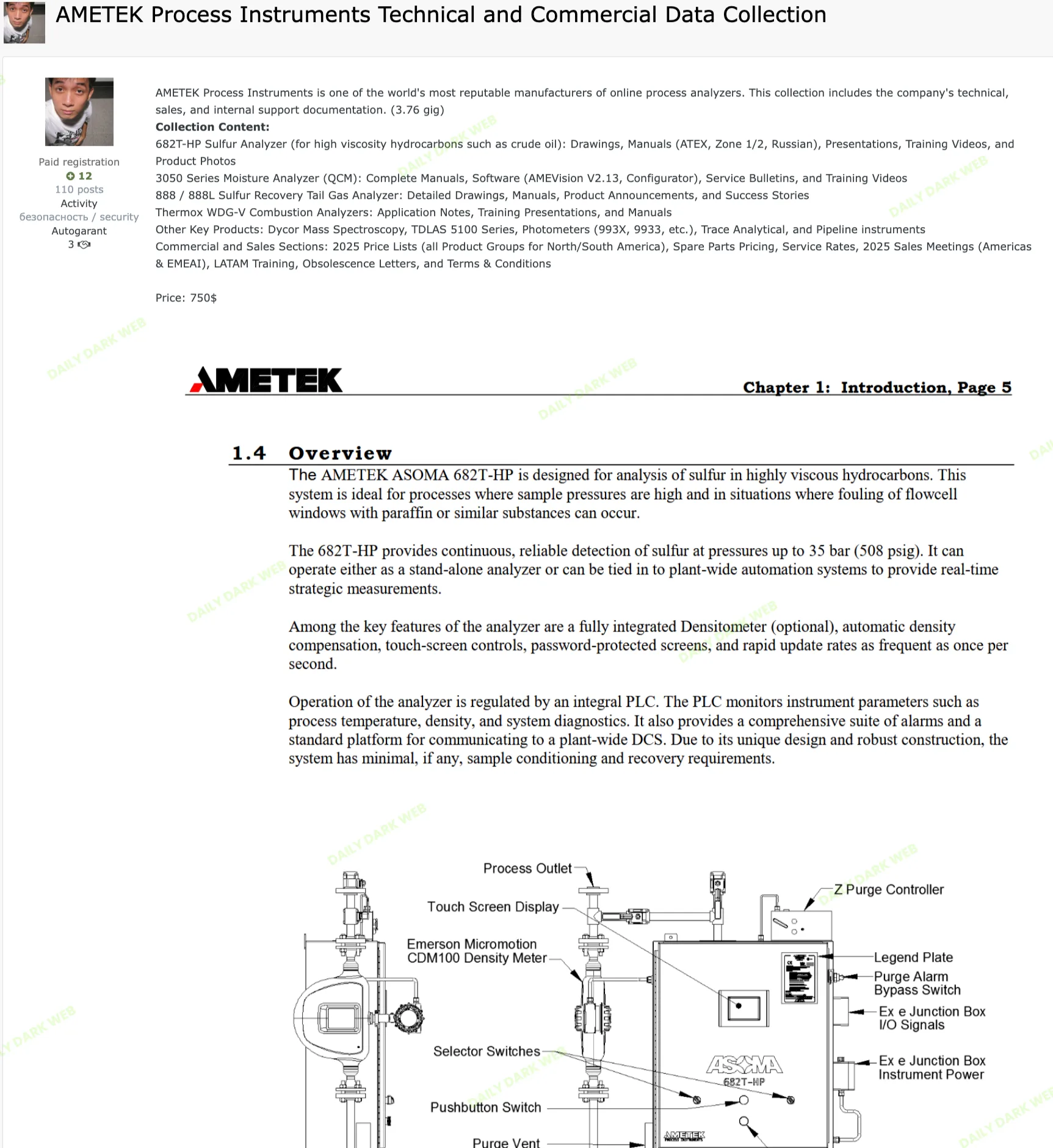 AMETEK Process Instruments has allegedly suffered a data breach with 3.76 GB of internal technical and commercial files offered for sale. Exposed materials reportedly include proprietary software, detailed technical drawings and manuals, 2025 price lists, spare parts and service pricing, sales presentations, training videos, and corporate legal documents. #AMETEKProcessInstruments #AMEVisionV2_13