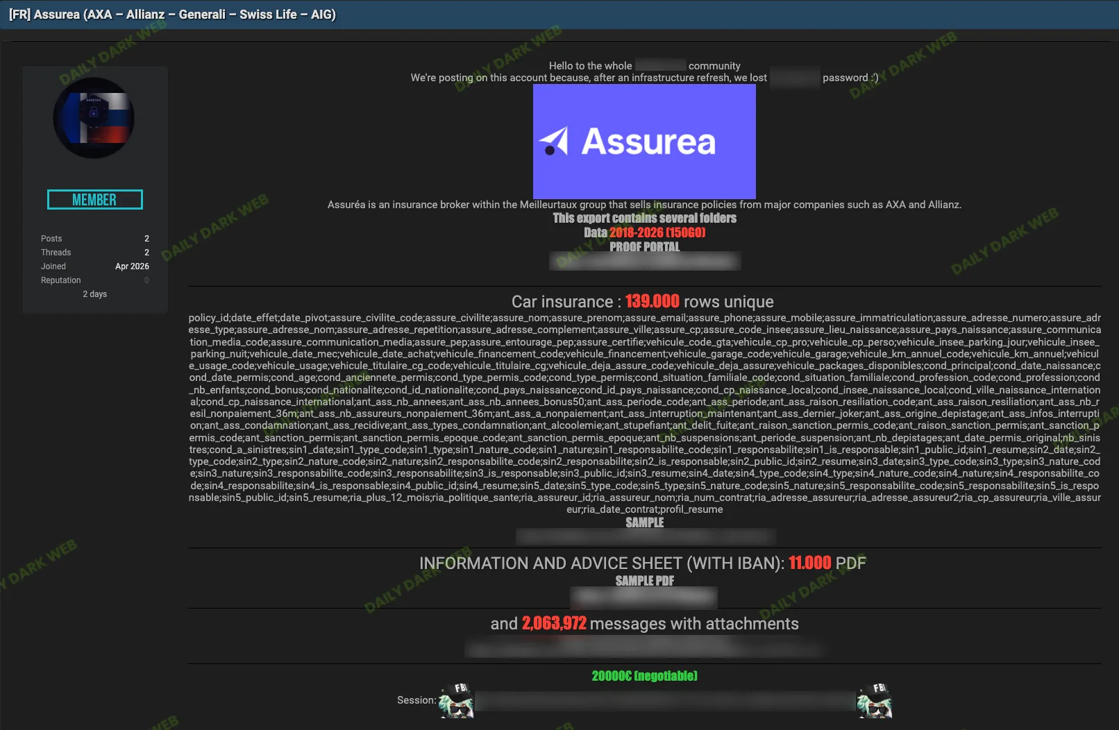 Assuréa, a French insurance broker within the Meilleurtaux group, has allegedly been compromised, resulting in a 150GB data dump reportedly being offered for sale for €20,000. The leak allegedly includes records from 2018–2026 with personal and insurance-related data affecting brokers and partner insurers. #Assuréa #Meilleurtaux
