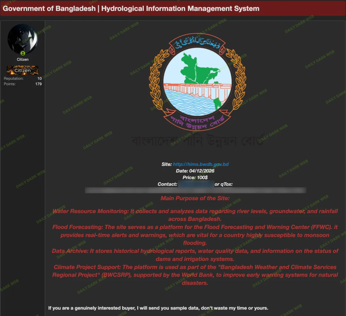 The Hydrological Information Management System (HIMS), run by the Bangladesh Water Development Board (BWDB) and supporting the Flood Forecasting and Warning Center (FFWC), appears to have been compromised with access and data allegedly offered for sale for $100. The data reportedly includes river levels, groundwater, rainfall, real-time flood alerts, historical hydrological reports, water quality, dam and irrigation status, and materials related to the Bangladesh Weather and Climate Services Regional Project (BWCSRP). #HIMS #BWDB #FFWC #BWCSRP