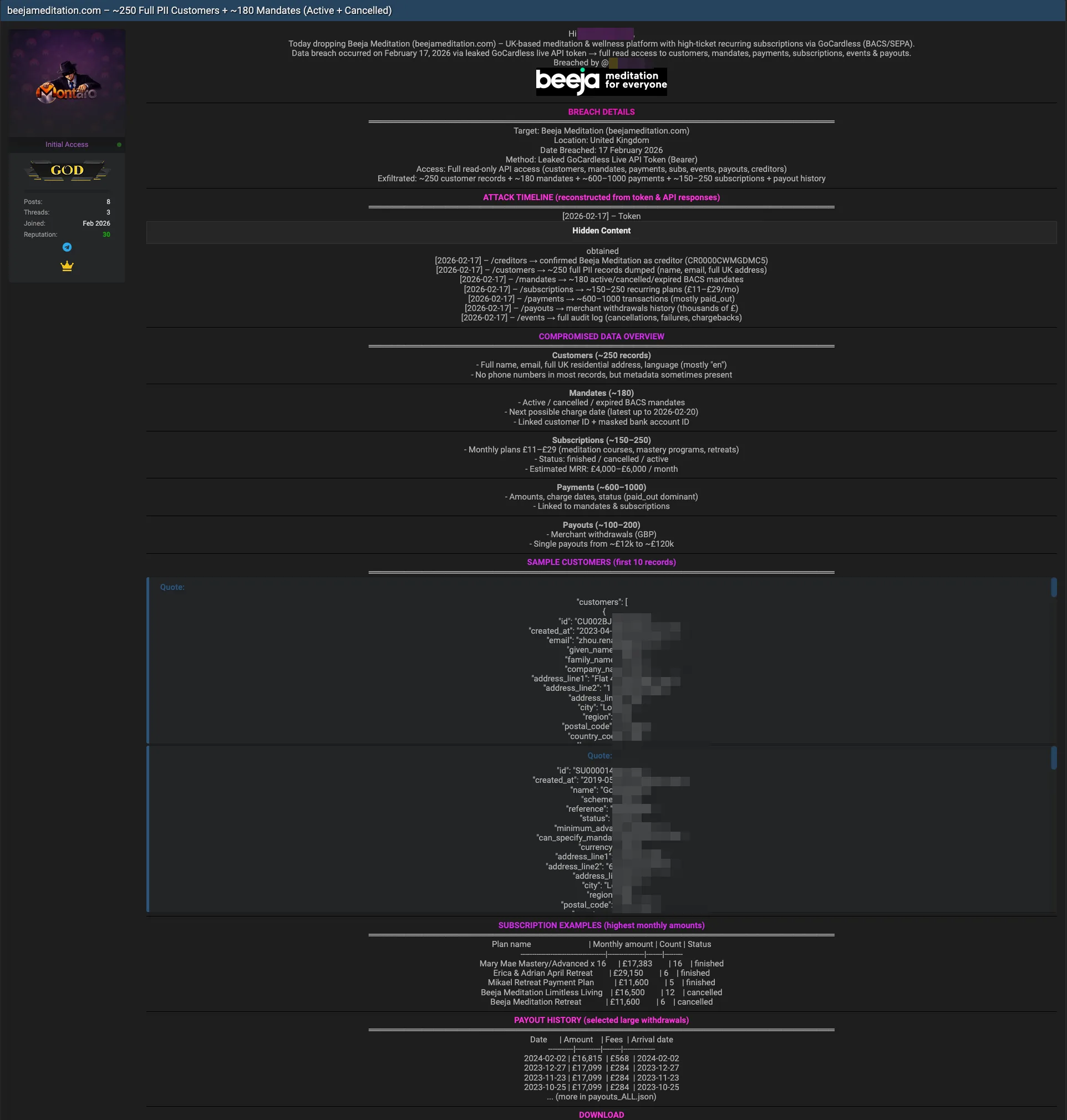 Beeja Meditation, a UK-based meditation and wellness platform, was allegedly compromised after a live GoCardless API token was leaked, granting unauthorized read-only access to internal customer and financial records. The February 17, 2026 breach reportedly exposed full names, email and full UK residential addresses, language preferences, bank mandate details (including active, cancelled, and expired BACS mandates), recurring subscription plans and estimated monthly recurring revenue, payment transaction histories, and merchant payout histories. #BeejaMeditation #GoCardless