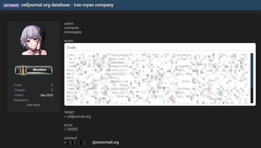 An unidentified hacker claims to have breached Iran’s Royan Company, exposing sensitive scientific and medical data. The attacker is offering the compromised database for sale, which includes user information and hashed passwords. #RoyanCompany #CellJournal