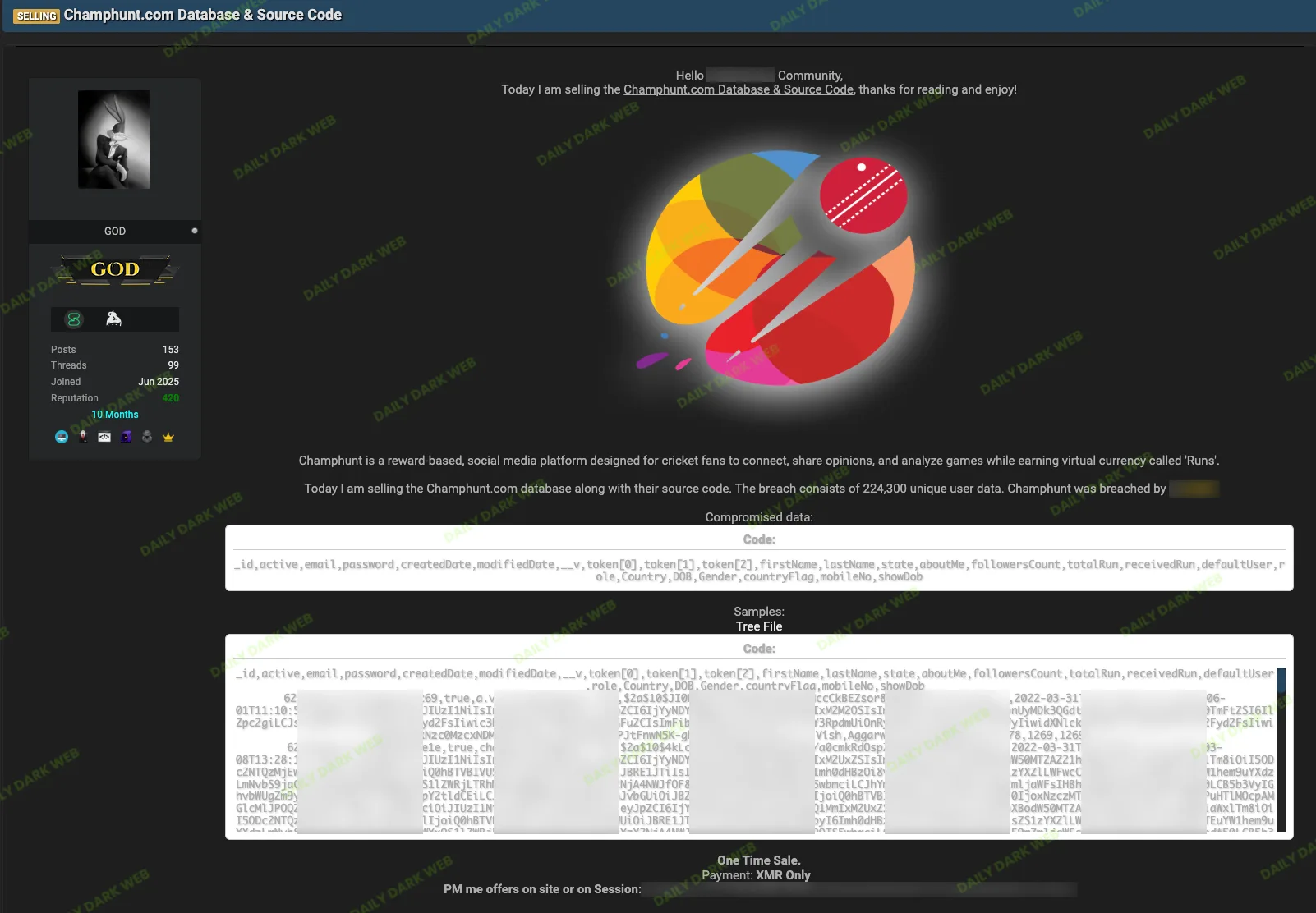 Champhunt, a reward-based social media platform for cricket fans, has allegedly been compromised with its database and source code offered for sale for a one-time payment in Monero (XMR). The actor claims the leak contains 224,300 user records including personal details, hashed passwords, profile photos, and platform metrics. #Champhunt #Monero