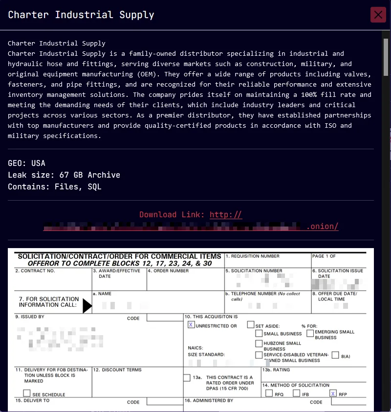The Sarcoma ransomware group has claimed to have compromised Charter Industrial Supply, stealing a large archive of sensitive data. The breach includes corporate files, databases, financial documents, technical drawings, and PII. #Sarcoma #CharterIndustrialSupply #DataBreach #RansomwareAttack