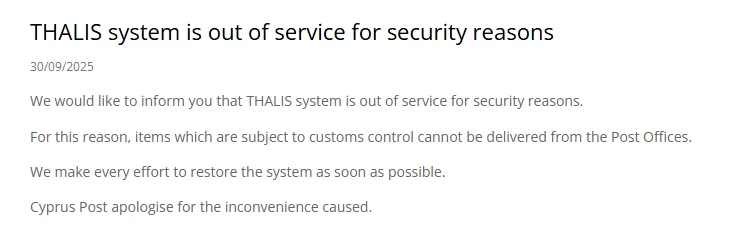 A threat actor claims to have breached Cyprus Post, exposing sensitive communications and parcel data, including information related to government agencies and embassies. The breach has led to the shutdown of the “THALIS” system for security reasons. #CyprusPost #ThalisSystem