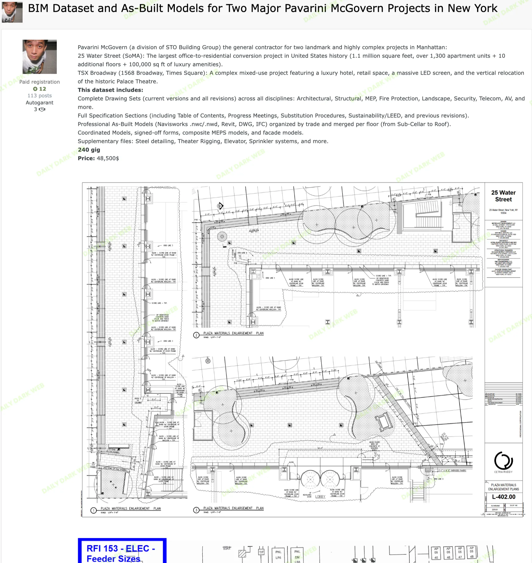 Pavarini McGovern, a division of STO Building Group and general contractor for major Manhattan landmarks, has allegedly been compromised and sensitive building data was put up for sale. The 240 GB dataset, offered for $48,500, reportedly includes complete drawing sets, full specifications, professional As-Built models (Navisworks, Revit, DWG, IFC), coordinated and signed-off models, and supplementary engineering files affecting projects such as 25 Water Street and TSX Broadway. #PavariniMcGovern #25WaterStreet