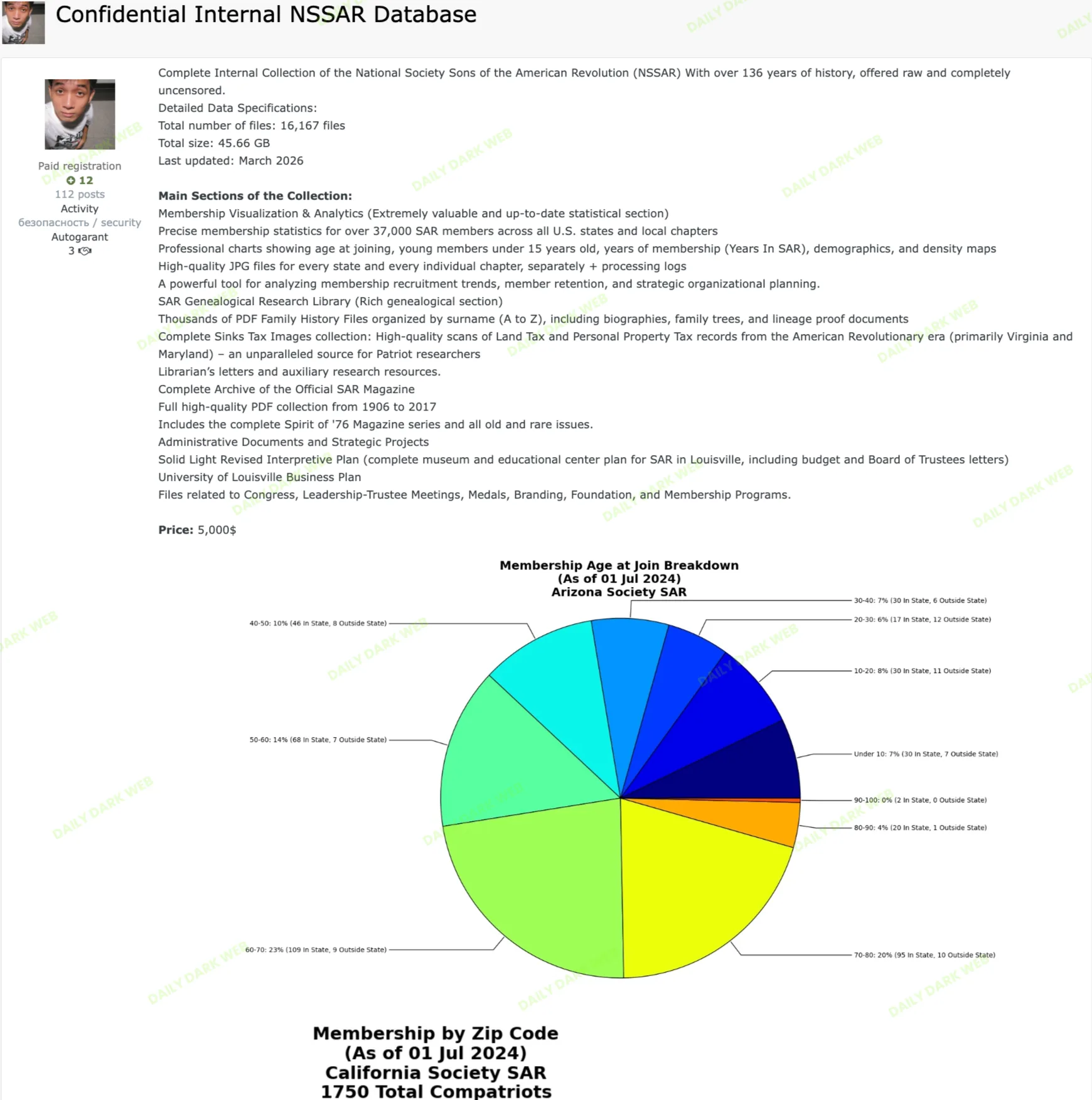 The National Society Sons of the American Revolution (NSSAR) appears to have suffered a data breach with an unidentified party offering a 45.66 GB database of over 16,000 files for sale. Exposed records reportedly include membership analytics for over 37,000 members, genealogical research and high-quality scans of Revolutionary-era records, administrative documents, and a complete SAR Magazine archive (1906–2017). #NSSAR #SARMagazine