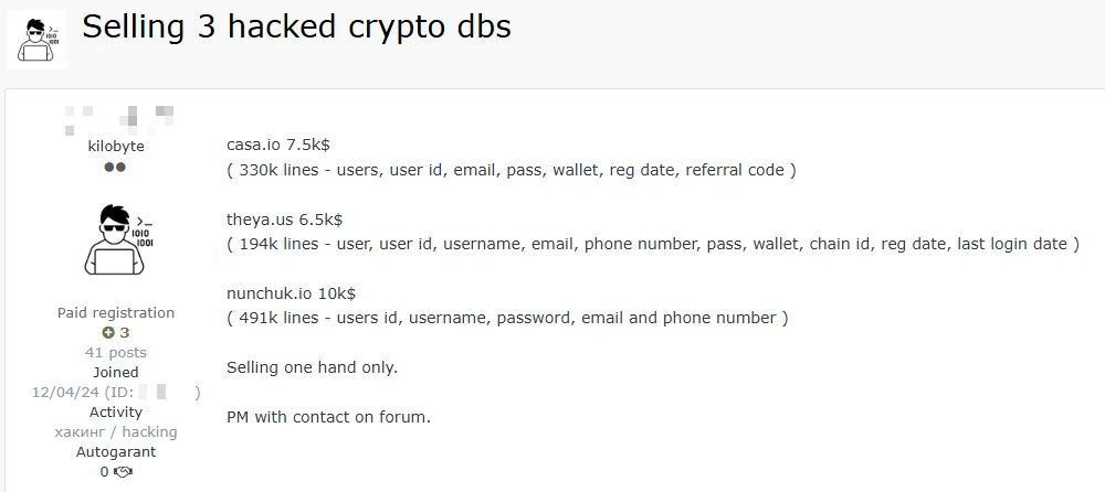 A threat actor has reportedly posted sensitive user databases from three US-based cryptocurrency companies for sale, risking the security of over one million users. The leak includes detailed personal information that could be exploited for phishing, SIM swapping, and other malicious activities. #CasaDataBreach #TheyaLeak #NunchukSecurity