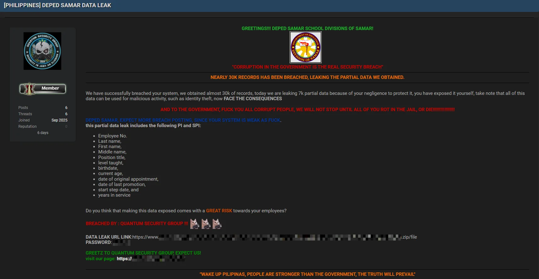 - A threat actor claims to have breached DepEd Samar, a regional department in the Philippines.