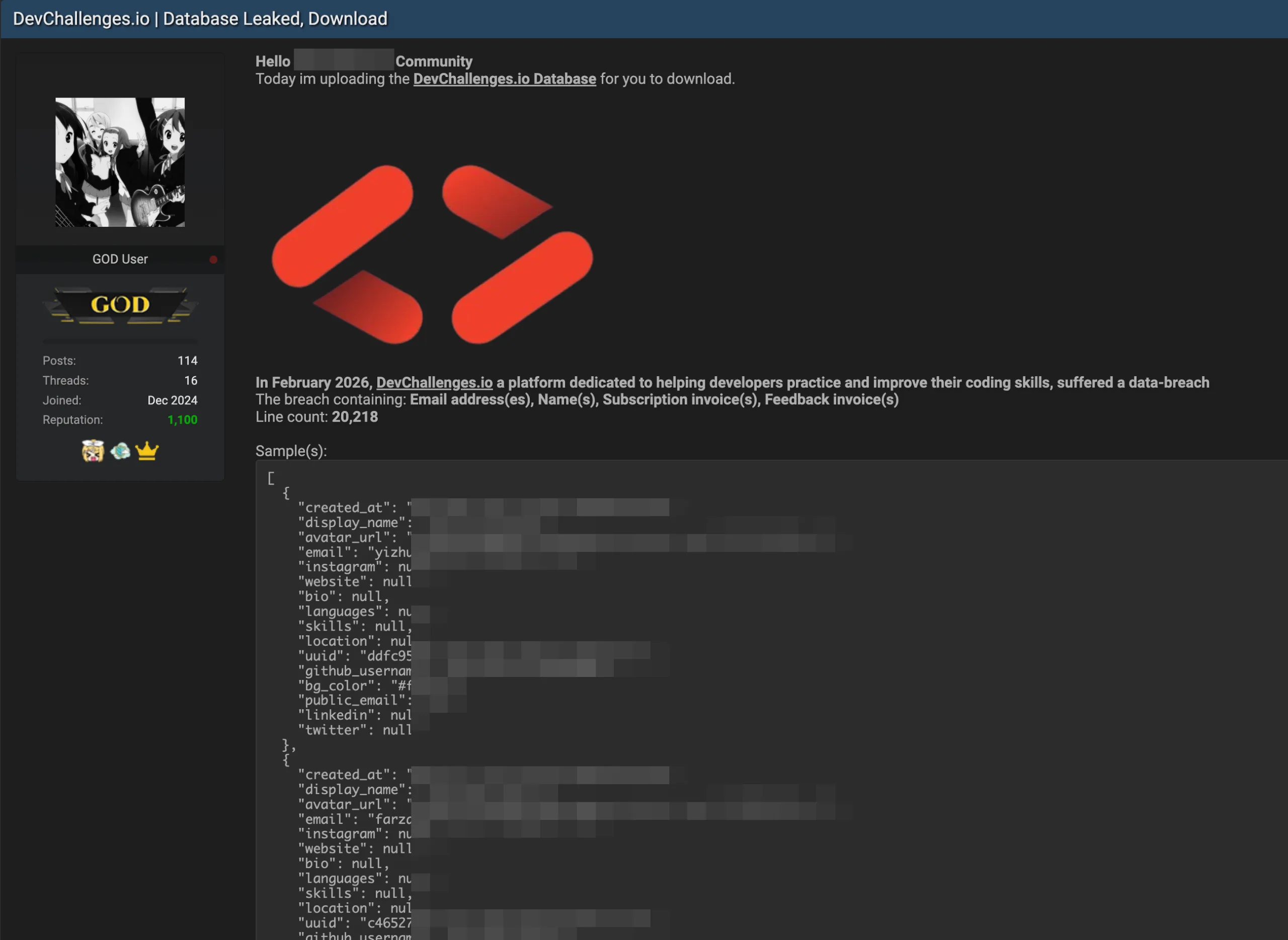 - DevChallenges.io reportedly suffered a data breach that surfaced in February 2026.
