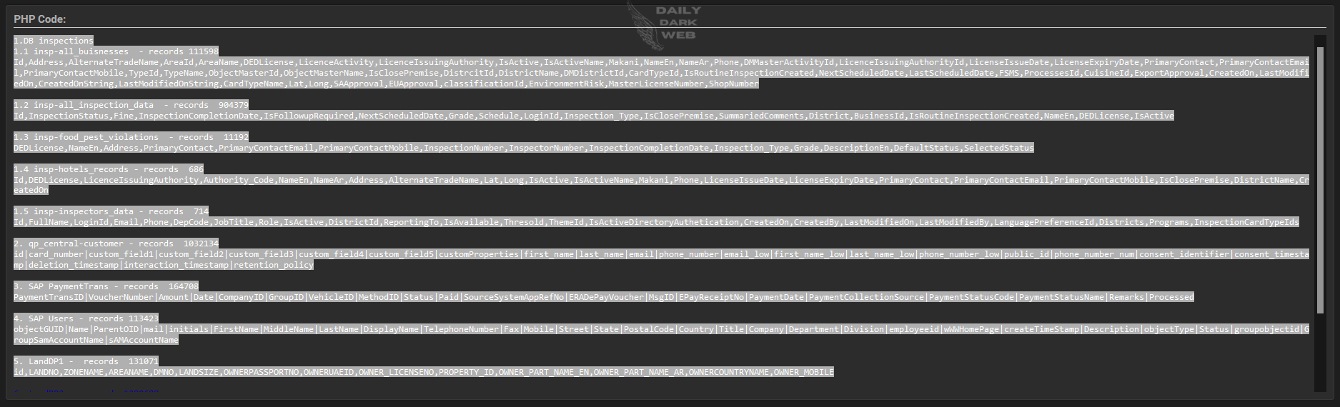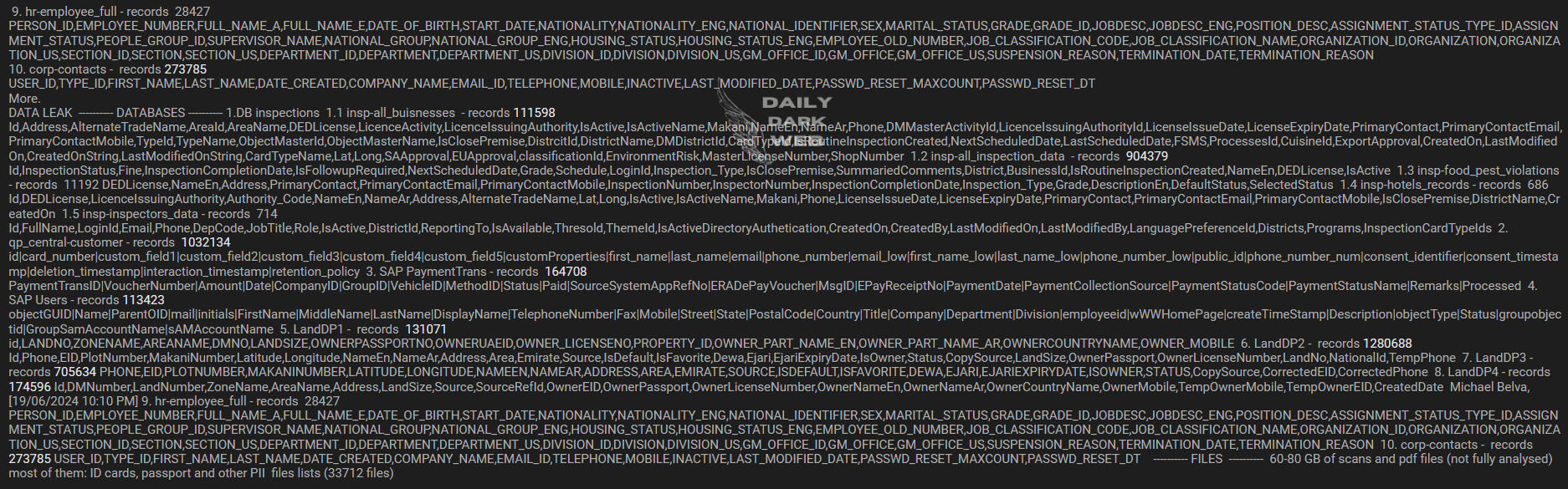 The threat actor claims that the breach involves a vast range of data, including records from various inspections, customer databases, and payment transactions. The data allegedly includes: