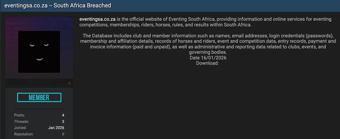 Eventing South Africa, the official body for eventing competitions and memberships in South Africa, is alleged to have been compromised with a database posted on a dark web forum dated January 16, 2026. The leak reportedly contains sensitive administrative and user data including full names, email addresses, login credentials, membership details, records of horses and riders, event entries, and payment information. #EventingSouthAfrica #DarkWebForum