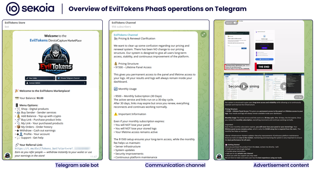 • EvilTokens is sold via Telegram (eviltokensadmin) as a PhaaS offering device code phishing kits, deployment bots, anti-bot pages, and affiliate management tools.