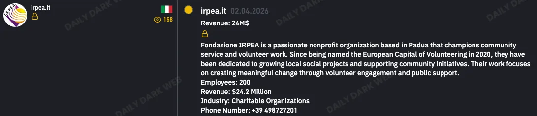 The INC Ransom group claims to have breached Fondazione IRPEA, a Padua-based nonprofit dedicated to community service and volunteering. The actor says the organization’s network and sensitive files were compromised, though the specific types of exfiltrated data have not been publicly detailed. #INCRansom #FondazioneIRPEA