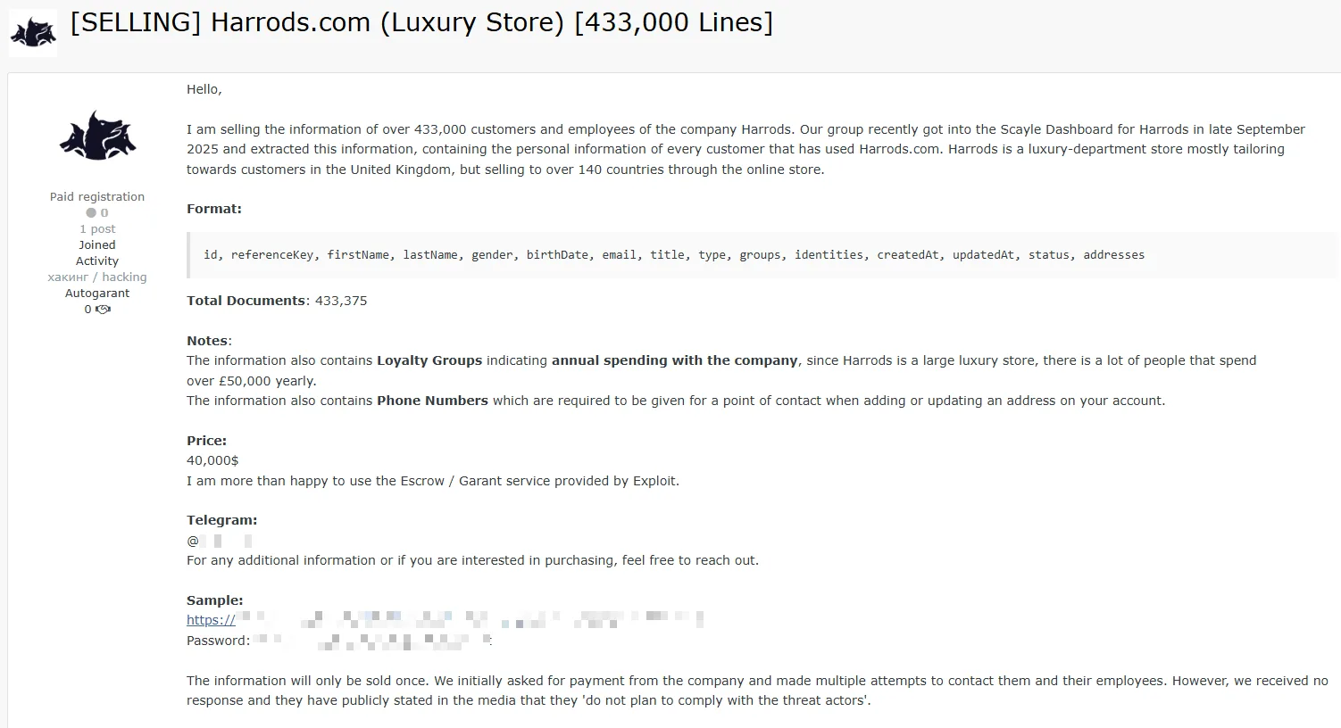 A threat actor claims to have hacked Harrods, stealing a database with personal data of over 433,000 customers and employees. The attacker attempted to negotiate payment but was ignored, and the data has been offered for sale. #Harrods #DataBreach #PII