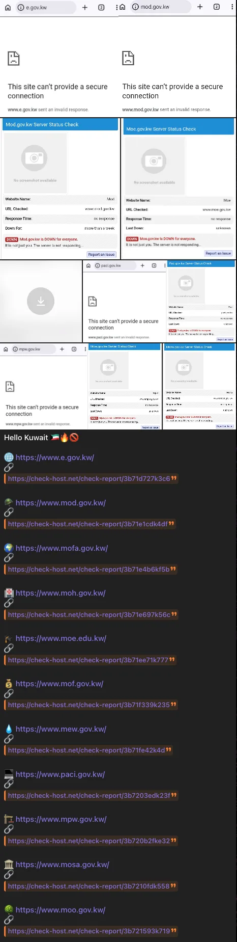 Hacktivist group Hider Nex claims to have launched a large DDoS campaign called βOpKuwait,β causing widespread outages across Kuwaiti government portals, state ministries, and financial institutions. The actor says the operation is intended to disrupt services rather than steal data, with impacts reported on public-facing web servers, the centralized e-government gateway, and online ministry systems. #HiderNex #OpKuwait #KuwaitStatePortal #BurganBank