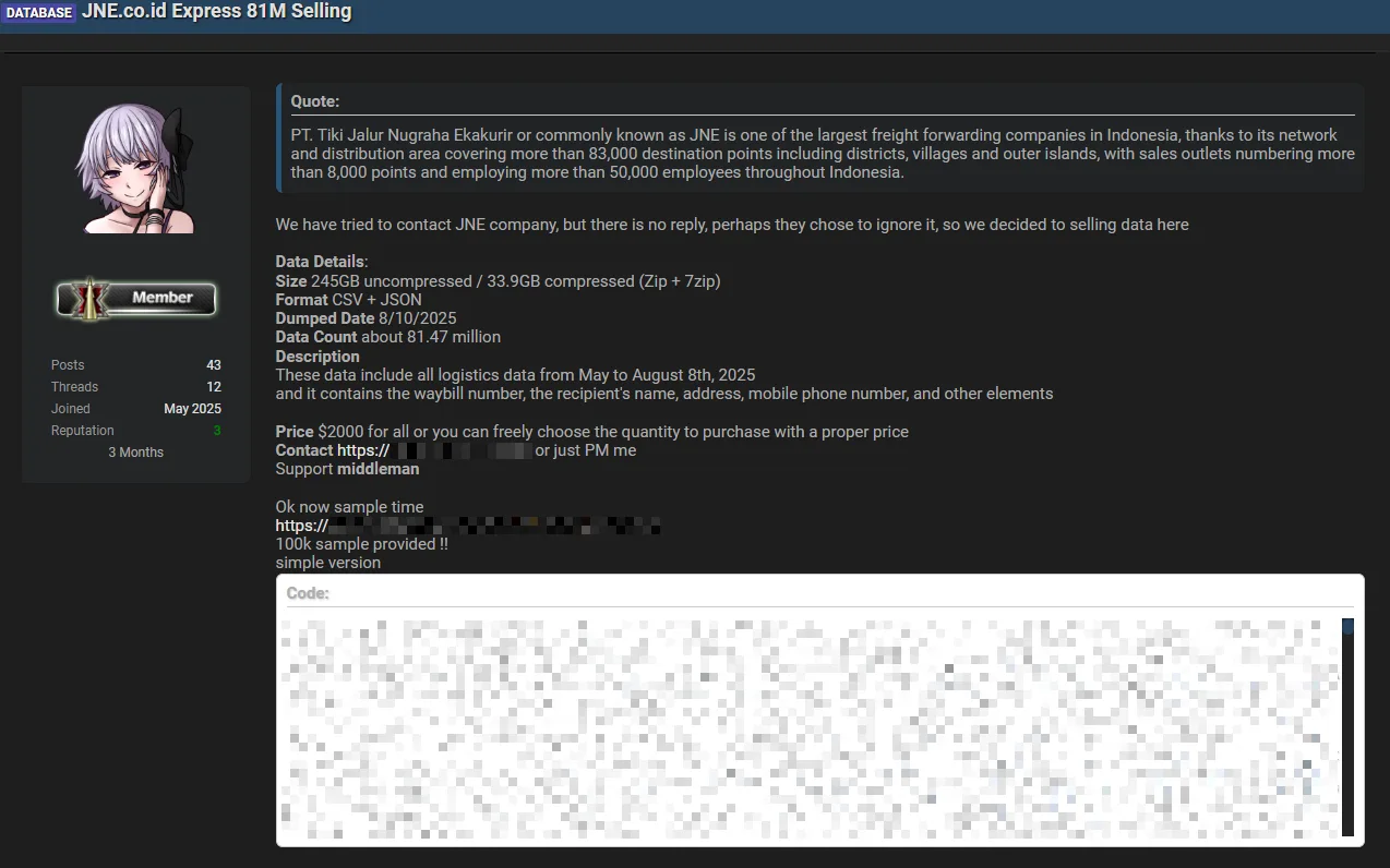 A large database belonging to Indonesian logistics firm JNE has been offered for sale on the dark web after a breach exposing millions of records. The compromised data includes PII and shipment information, posing significant risks to customers and the company. #JNE #DarkWebSale