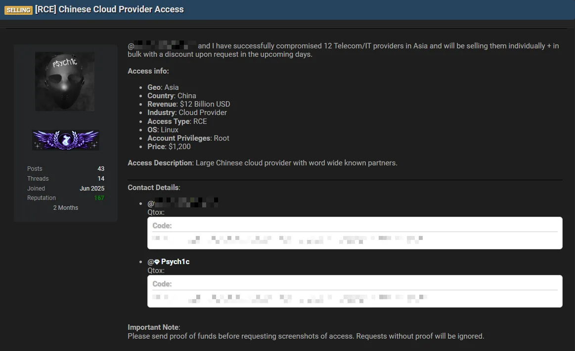 • The threat actor offers privileged access to a major Chinese cloud provider for $1,200.