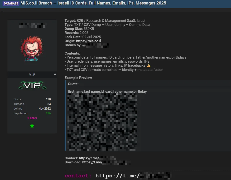 A cybersecurity breach at Israeli SaaS provider MIS.co.il has resulted in the leak of over 2,000 individuals’ sensitive data, including personal and internal information. The leaked database raises concerns about identity theft, phishing, and misuse of user credentials. #MIScoIl #DataBreach