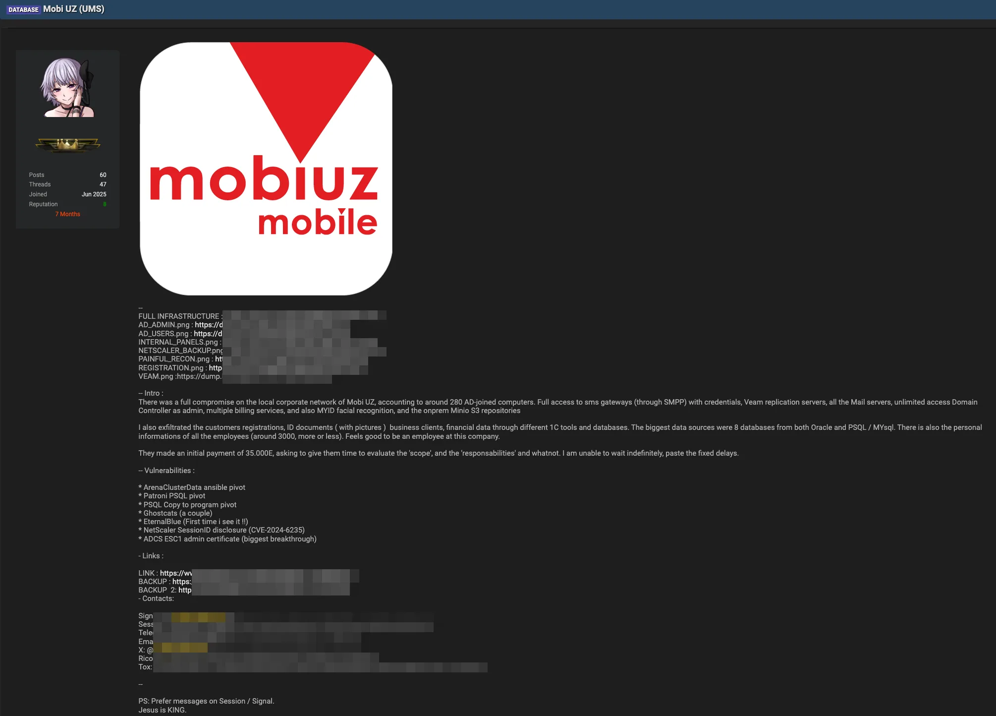 Mobi UZ (UMS), a major Uzbek telecom operator, reportedly suffered a full compromise of its local corporate network affecting roughly 280 Active Directory-joined machines and granting attackers administrative control over critical systems such as SMS gateways, Veeam replication servers, mail systems, billing services, MYID facial recognition, and on-premises Minio S3 repositories. The threat actor claims to have exploited EternalBlue, NetScaler SessionID disclosure (CVE-2024-6235), and an ADCS ESC1 admin certificate misconfiguration to exfiltrate customer registrations, ID documents with photos, business and financial records, eight databases, and personal data of about 3,000 employees, while Mobi UZ reportedly paid an initial β¬35,000 to delay publication. #MobiUZ #EternalBlue #NetScaler #ADCS #Minio