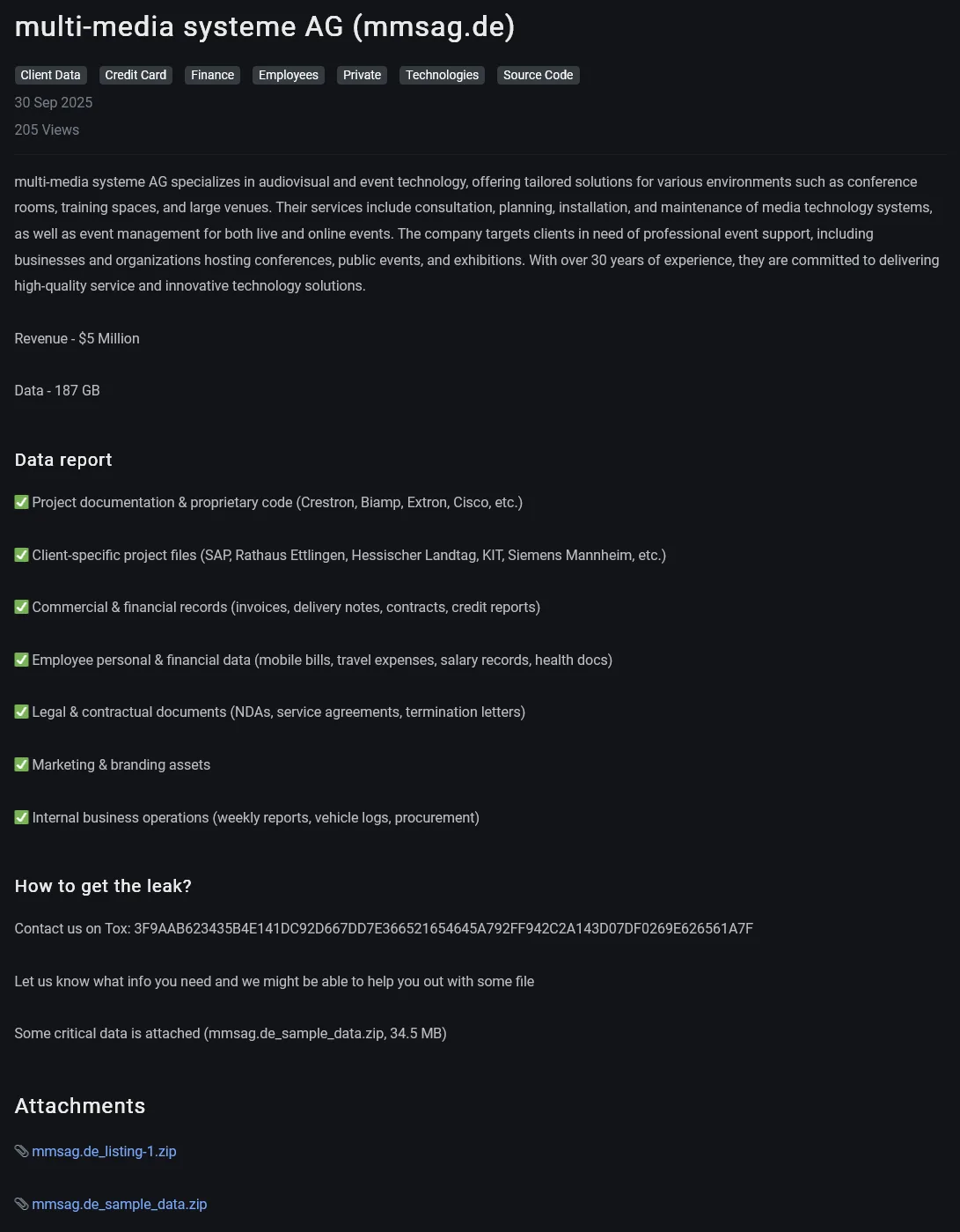 The J ransomware group claims to have compromised German audiovisual company mmsag, exfiltrating 187 GB of sensitive data. The stolen data includes proprietary code, client files, financial records, employee personal information, legal documents, and internal business data. #Jransomware #mmsag #cyberattack #databreach