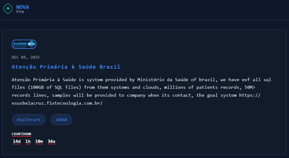 The Nova ransomware group claims to have breached Brazil’s primary healthcare system, targeting the e-SUS platform and demanding a 14-day deadline for their ransom. The breach involves the theft of 100GB of SQL data comprising millions of patient records and internal system files. #NovaRansomware #eSUS #BrazilHealthSystem