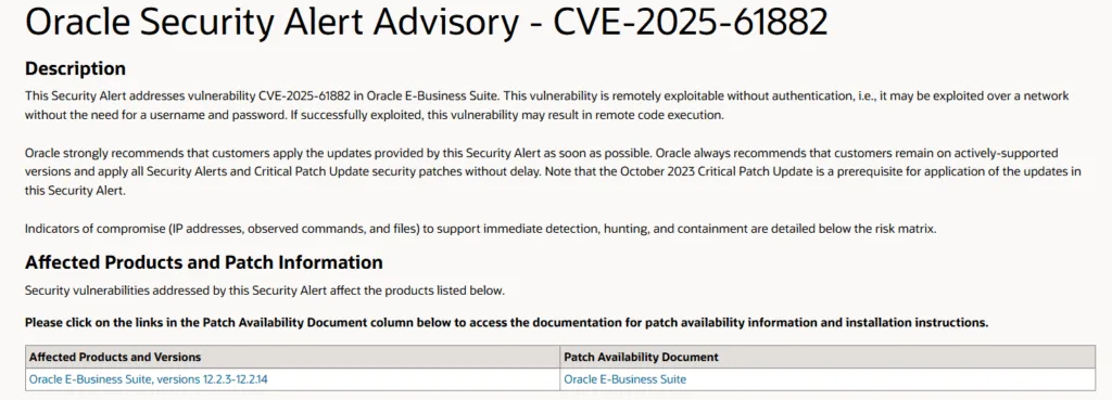 - The CVE-2025-61882 vulnerability allows remote code execution without authentication.