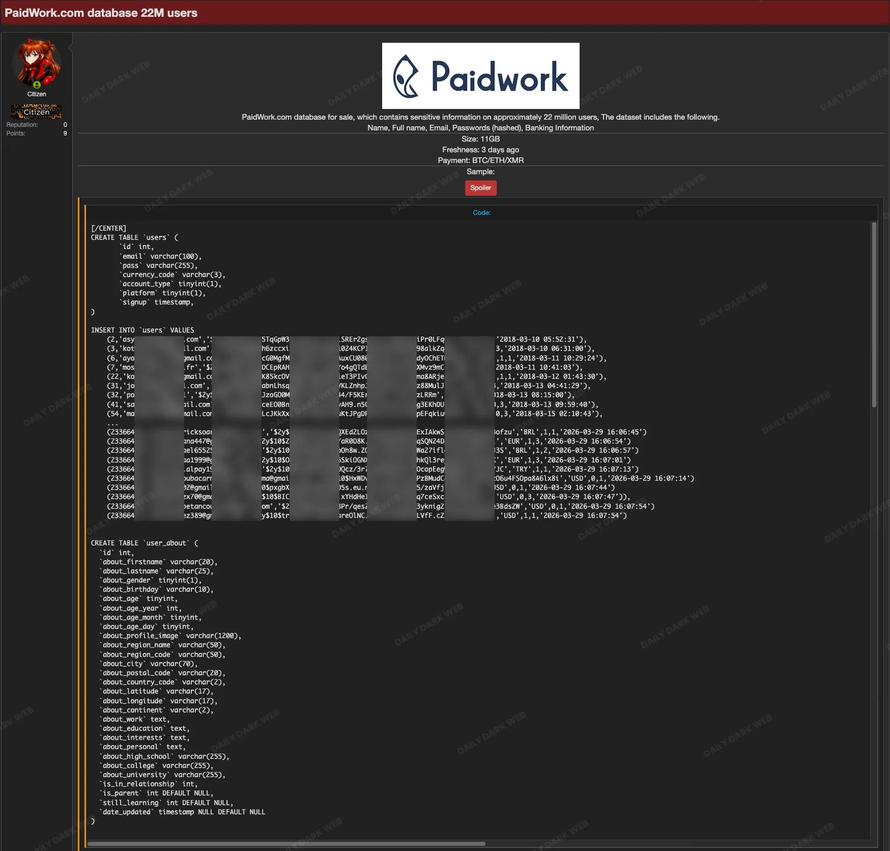 PaidWork, a popular online monetization and micro-task platform, has allegedly been breached, exposing an approximately 11GB database containing sensitive records for about 22 million users. The dataset—reported for sale on a cybercrime forum for BTC/ETH/XMR—includes personal details, hashed passwords, banking and PayPal information, cryptocurrency wallet addresses, billing addresses, IPs, and demographic data. #PaidWork #PayPal
