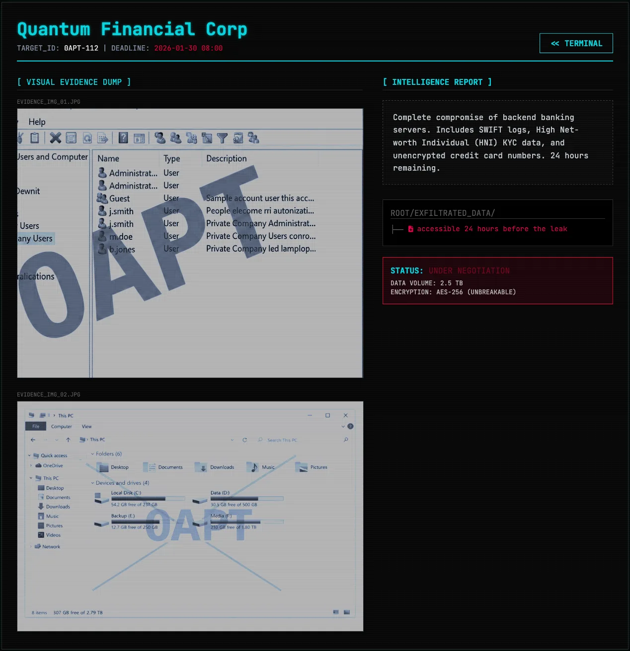 The 0APT ransomware group claims to have compromised Quantum Financial Corp, listing the company on its data leak site and setting a January 30, 2026 negotiation deadline. The actors allege they exfiltrated 2.5 TB of data from backend banking servers, encrypted files with AES-256, and took SWIFT logs, HNI KYC records, unencrypted credit card numbers, and internal user and administrative access logs. #0APT #QuantumFinancialCorp