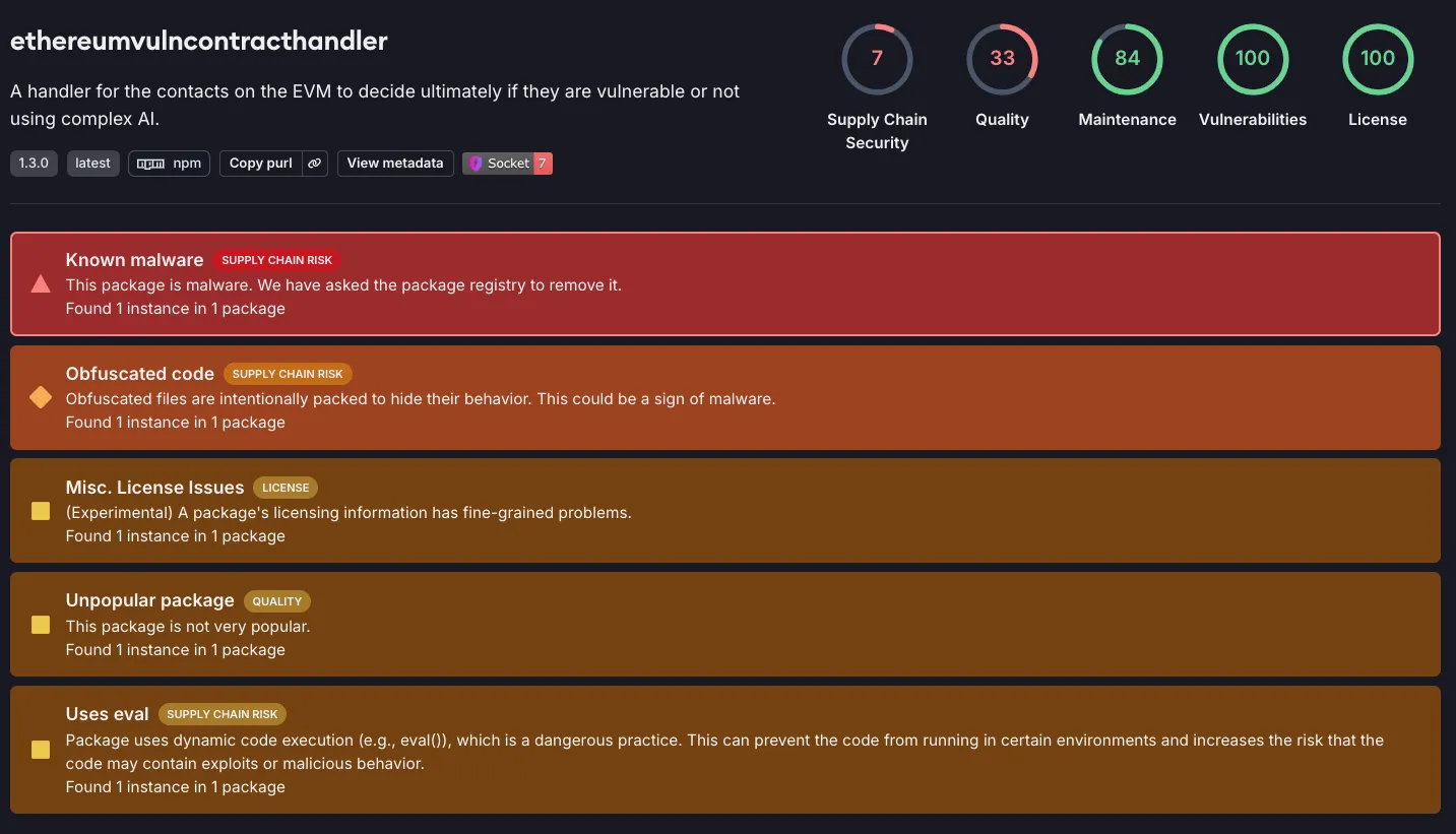 Socket’s threat research team has discovered a malicious npm package, ethereumvulncontracthandler, which is posing as a tool for detecting vulnerabilities in Ethereum smart contracts but instead deploys Quasar RAT, a versatile remote access trojan, onto developers’ machines.