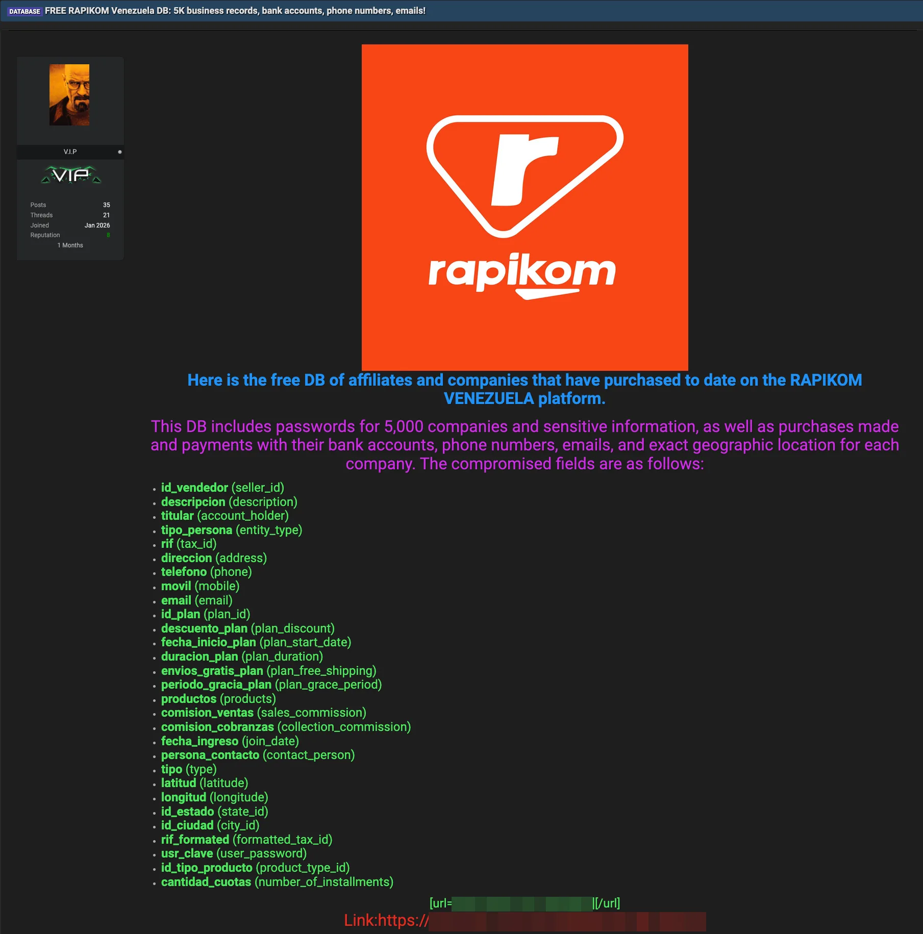 Rapikom, a Venezuelan e-commerce and affiliate platform, appears to have been breached and an online database allegedly containing records for 5,000 companies and affiliates was published. The exposed information reportedly includes seller IDs, account holder names, tax IDs (RIF), full addresses with coordinates, phone numbers, emails, user passwords, plan and product details, commissions, join dates, contact persons, and installment information. #Rapikom #RIF