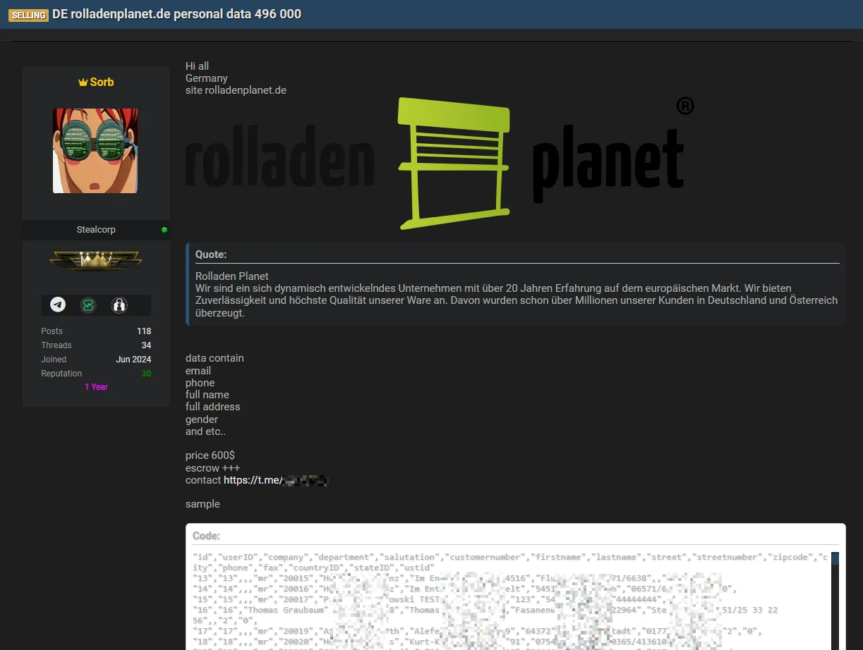 A German retailer, Rolladen Planet, has allegedly experienced a data breach, with a threat actor selling nearly 500,000 customer records. The compromised database includes sensitive personal details of individuals and businesses across Germany and Austria. #RolladenPlanet #DataBreach #CustomerData #CyberThreats