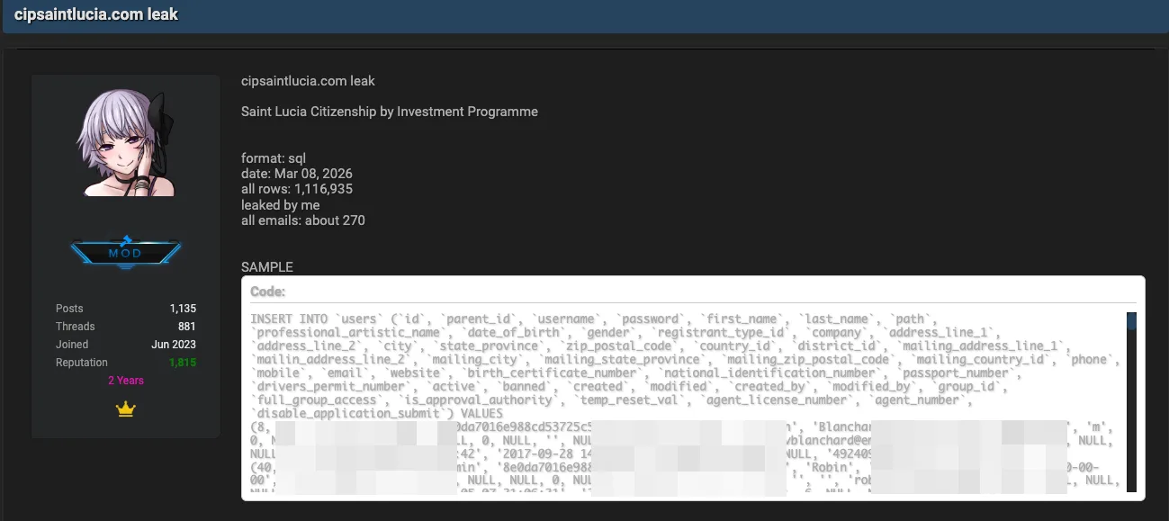 A database of more than 1.1 million records from the Saint Lucia Citizenship by Investment Programme appears to have been published on a cybercrime forum by an unidentified actor. The leaked dataset reportedly contains highly sensitive applicant and administrative information, including full names, contact details, passport numbers, hashed passwords, and detailed application documents such as birth certificates, CVs, police clearances, and proof of net worth. #SaintLuciaCIP #SaintLucia