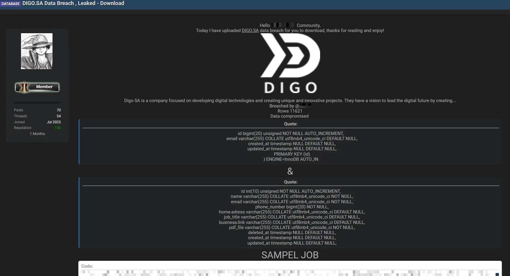 A threat actor has leaked a database from DIGO[.]SA, exposing sensitive client and applicant data on the dark web. This incident poses risks such as identity theft and targeted phishing attacks. #DIGO #DarkWebLeak
