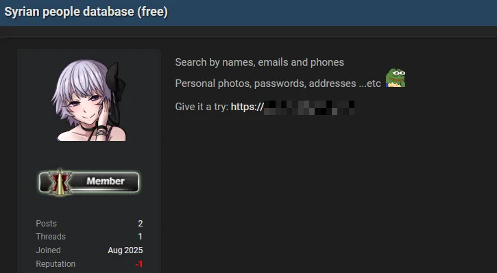 - The platform is advertised on a hacking forum and claims to be the largest Syrian people database.