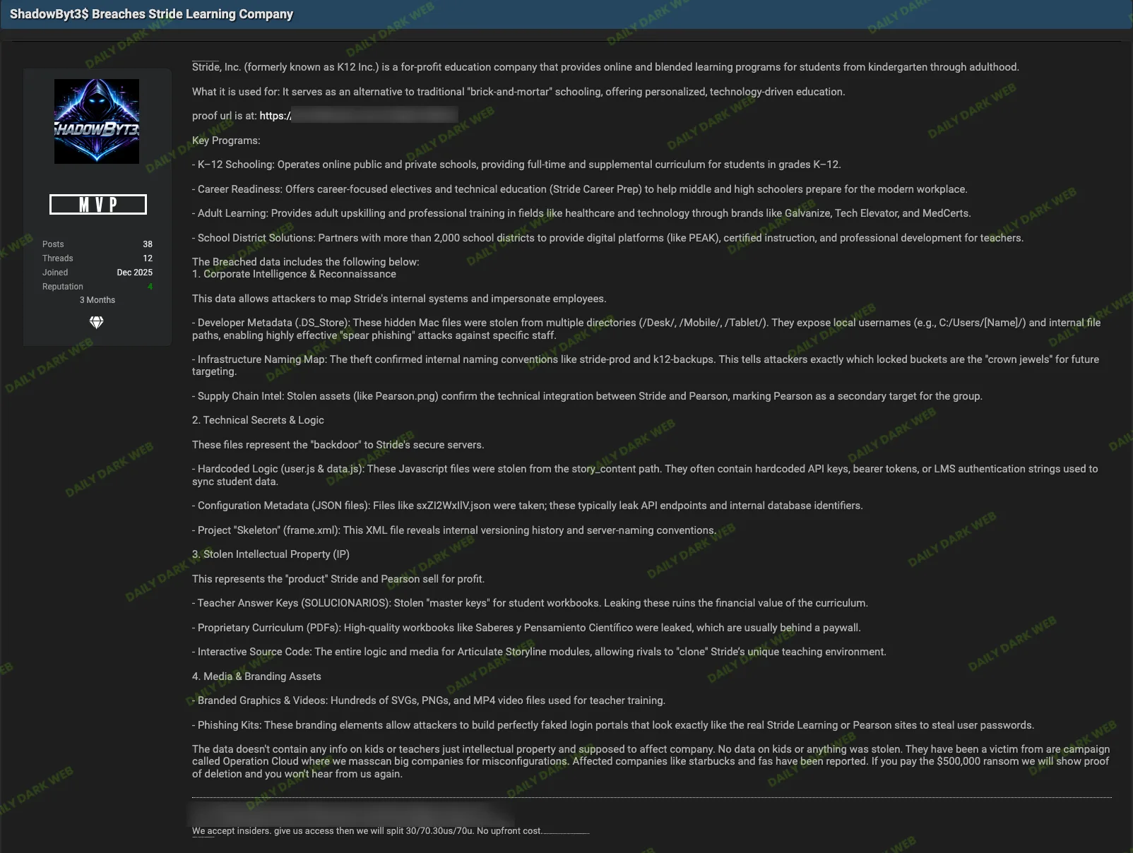 Stride Learning Company was reportedly compromised by threat actor ShadowByt3$ as part of a mass-scanning campaign called “Operation Cloud” that targets misconfigurations in large organizations. The attacker is demanding $500,000 and claims to have exfiltrated corporate assets—including developer metadata, technical secrets, intellectual property, and media/branding assets—while asserting no student or teacher information was taken. #ShadowByt3$ #StrideLearning