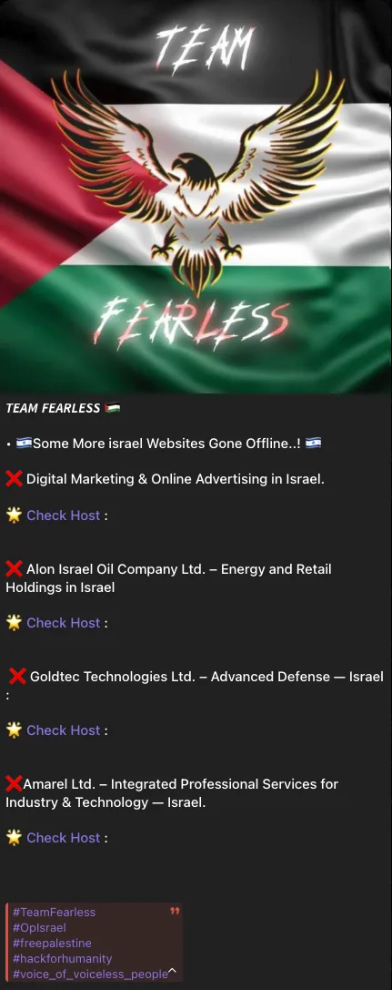 Team Fearless claims it carried out distributed denial-of-service (DDoS) attacks that forced the websites of four Israeli entities offline. The group announced the campaign on its Telegram channel under the banners #OpIsrael and #freepalestine, naming a digital marketing and advertising agency, Alon Israel Oil Company Ltd., Goldtec Technologies Ltd., and Amarel Ltd. as alleged victims. #TeamFearless #OpIsrael #AlonIsraelOilCompanyLtd #GoldtecTechnologiesLtd #AmarelLtd