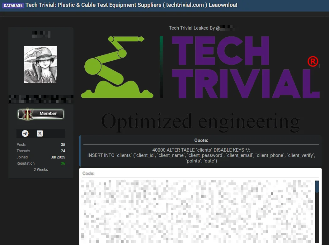 A data breach has compromised Tech Trivial’s client database, exposing sensitive information of 40,000 clients on a hacker forum. This incident could lead to phishing and other malicious activities affecting industrial clients relying on their equipment. #TechTrivial #DataBreach