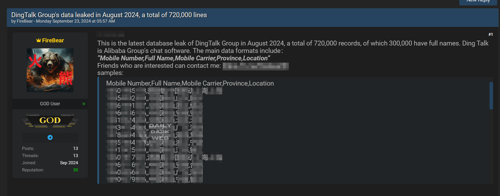 The chat software Ding Talk, operated by Alibaba Group, also suffered a major breach in August 2024. A total of 720,000 records were exposed, with 300,000 entries revealing users’ full names. The compromised data consists of sensitive information such as mobile numbers, locations, and mobile carriers. Ding Talk is a widely used communication platform in China, and this breach raises significant privacy concerns for its users.