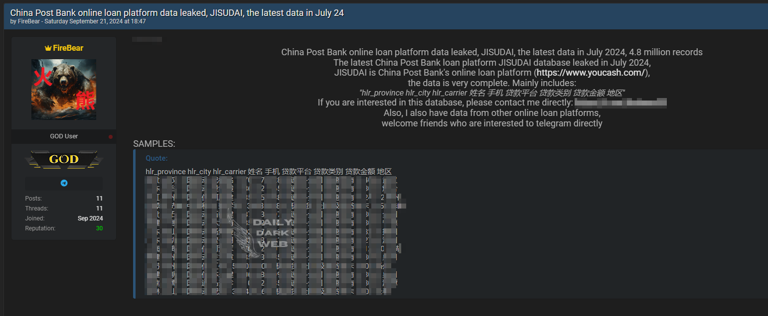 The JISUDAI loan platform, operated by China Post Bank, was another victim of a large-scale breach in July 2024. A database containing 4.8 million records was leaked, with extensive details about loan applicants, including their loan categories, amounts, and personal identification information. This breach affects individuals across China who have used the online platform for loan services, exposing both financial and personal data.
