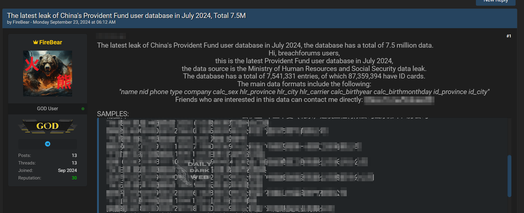 In a massive breach, the China Provident Fund’s user database was leaked in July 2024, exposing 7.5 million entries. Among the compromised data, a staggering 87 million records were found containing ID card information. The dataset includes personal details such as names, phone numbers, and employment information, putting millions of Chinese citizens at risk of identity theft and fraud.