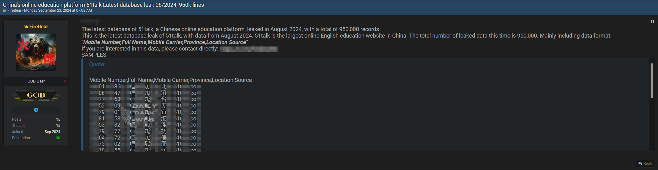 In August 2024, 51Talk, a leading online English education platform in China, experienced a breach that exposed 950,000 records. Personal details such as mobile numbers, full names, and location data were leaked. As a prominent platform for learning English, this breach affects a large portion of its user base, with sensitive data now available for malicious actors to exploit.