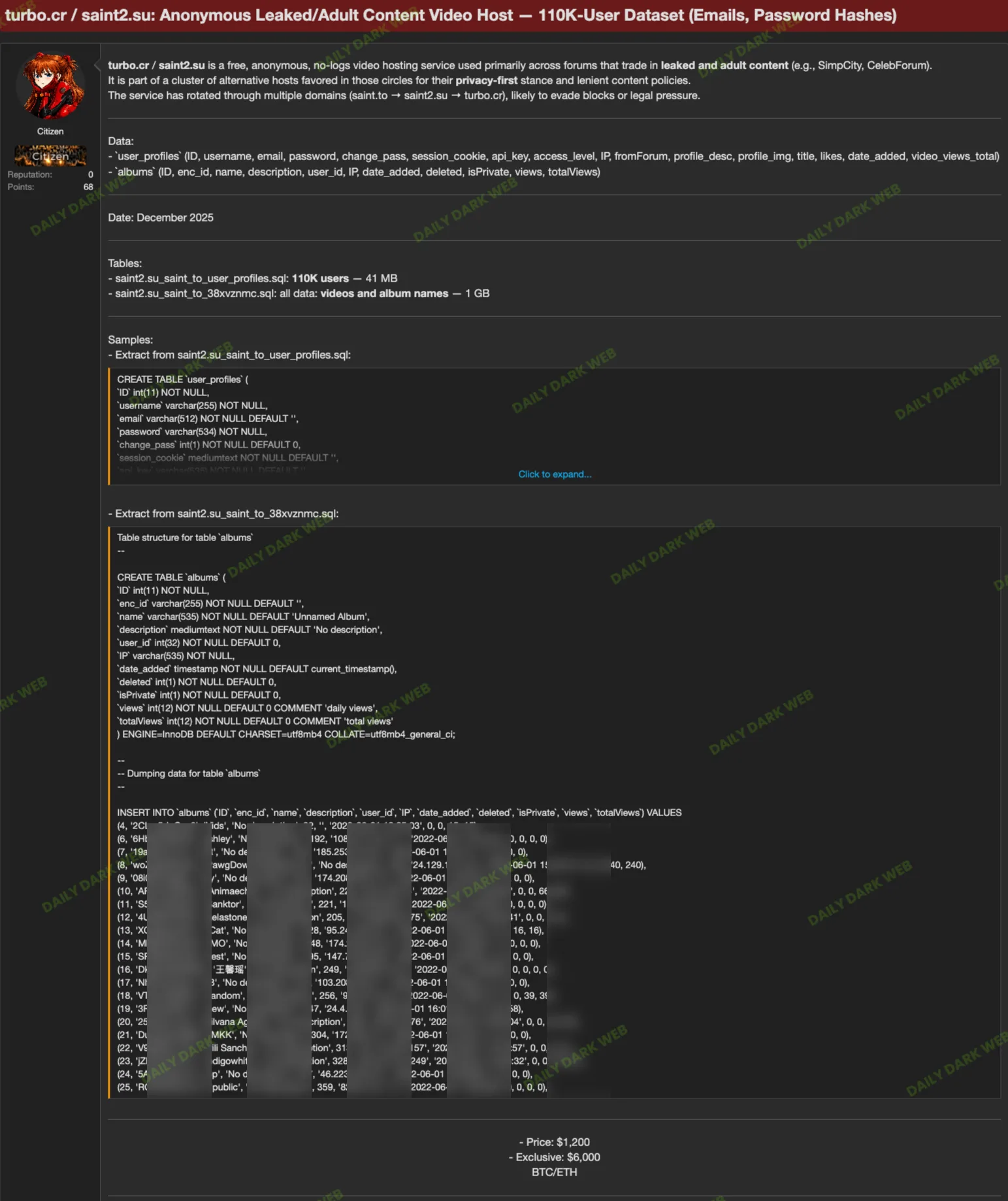 The privacy-focused video hosting service turbo.cr / saint2.su, which rotates domains to evade legal pressure, has allegedly been compromised with its database listed for sale on a dark web forum. The 1.04 GB dataset reportedly contains about 110,000 user profiles including email addresses, password hashes, session cookies, API keys, and detailed profile and album metadata. #turbo.cr #saint2.su