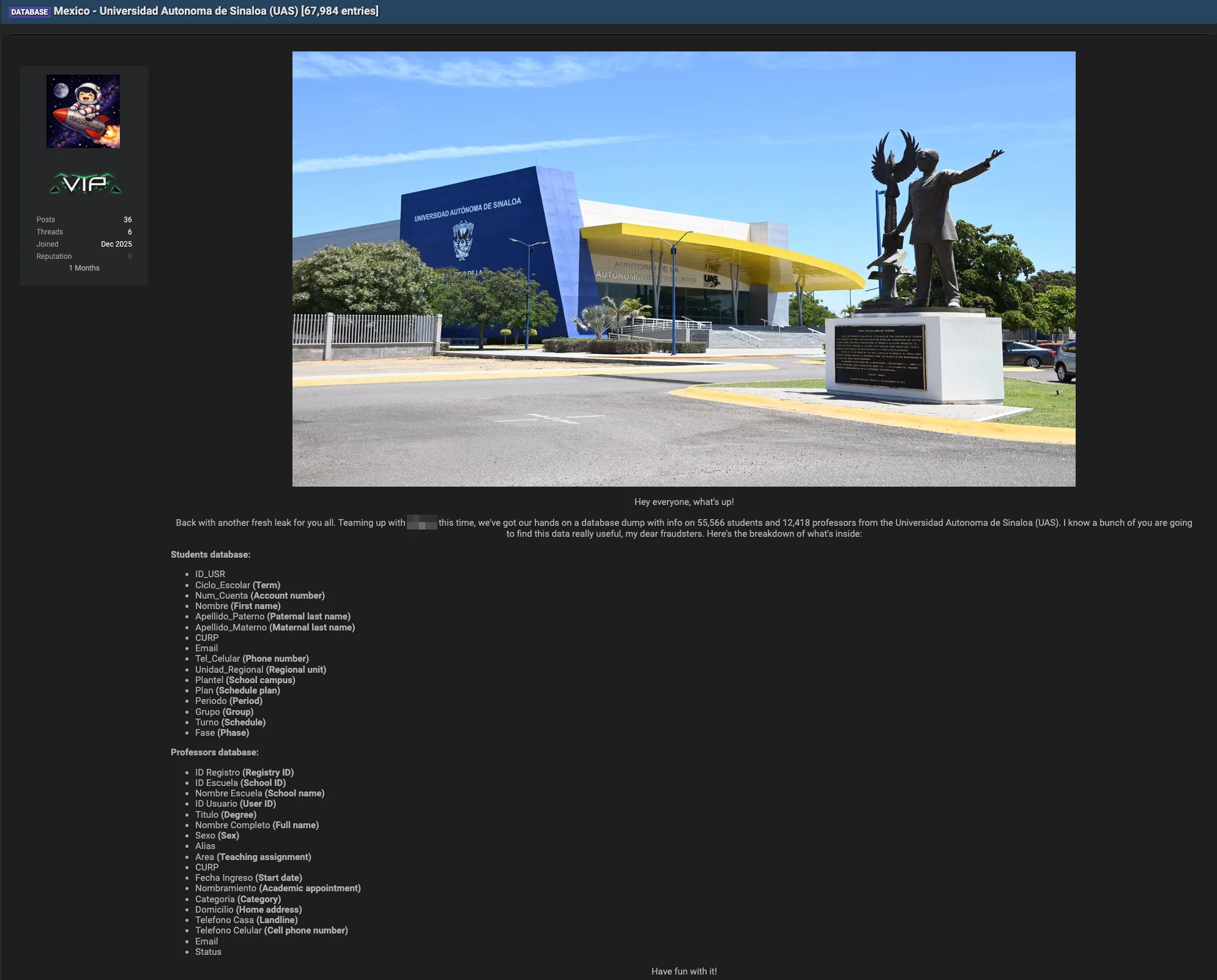 Universidad Autónoma de Sinaloa (UAS) reportedly suffered a data breach that exposed personal records for 55,566 students and 12,418 professors, which were posted on a popular hacking forum. The leaked database allegedly includes highly sensitive identifiers and contact information such as full names, CURP, account numbers, addresses, phone numbers, emails, and academic/professional details. #UniversidadAutonomaDeSinaloa #UAS