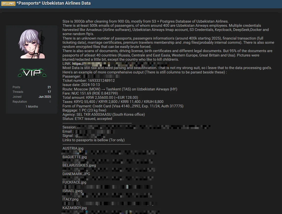 A threat actor claims to have sold a 300GB database belonging to Uzbekistan Airlines, containing sensitive passenger and employee data. The breach includes passport scans, financial details, corporate credentials, and internal communications, highlighting significant data exposure. #UzbekistanAirlines #DataBreach